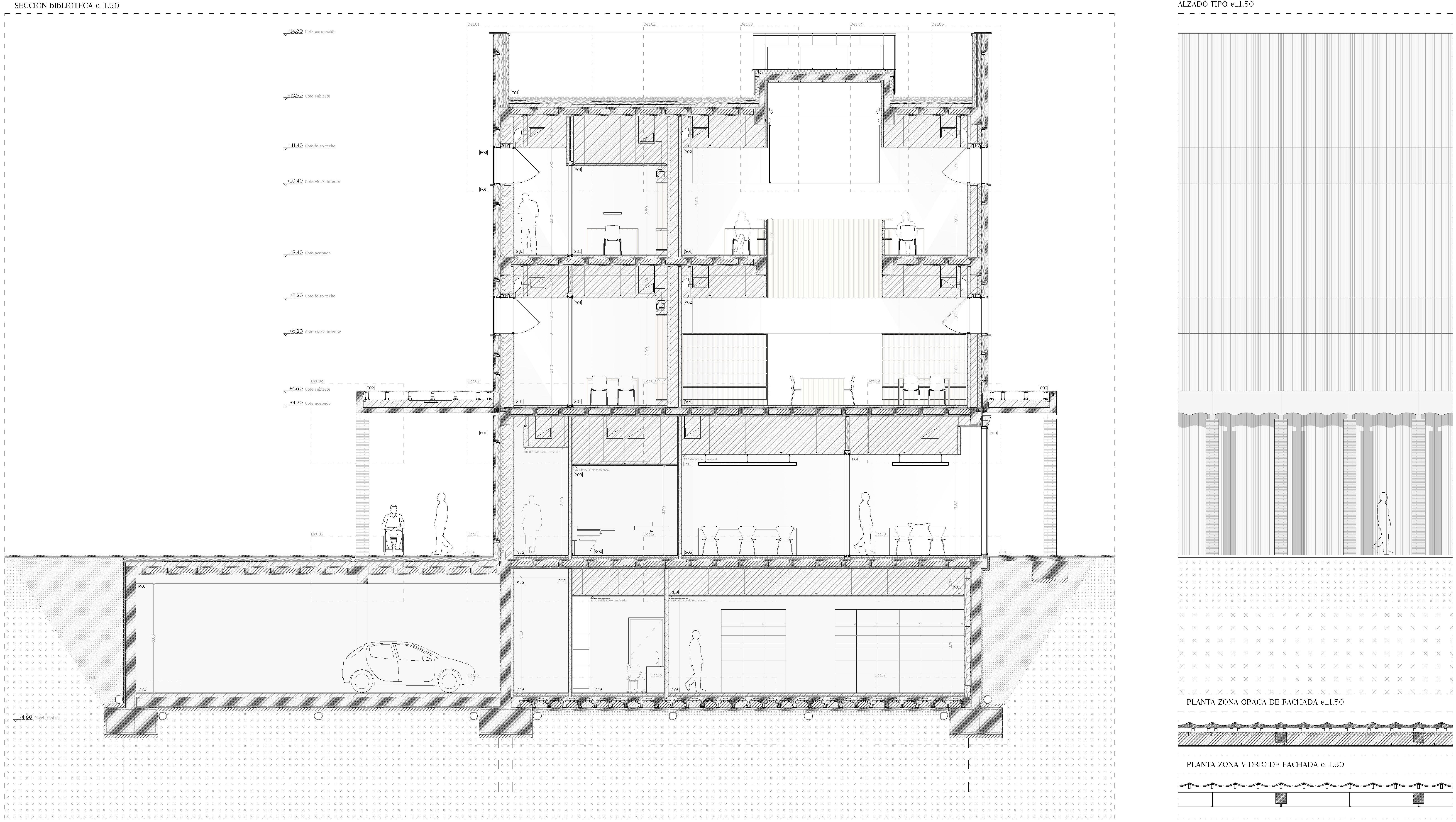 El programa se divide en dos potentes volúmenes, el pequeño da servicio a unas pequeñas salas de exposiciones, el mayor alberga la biblioteca, iluminada perimetralmente mediante bandas de luz difusa abierta a través del hormigón y cenitalmente a través de un gran lucernario colgado de la última planta.